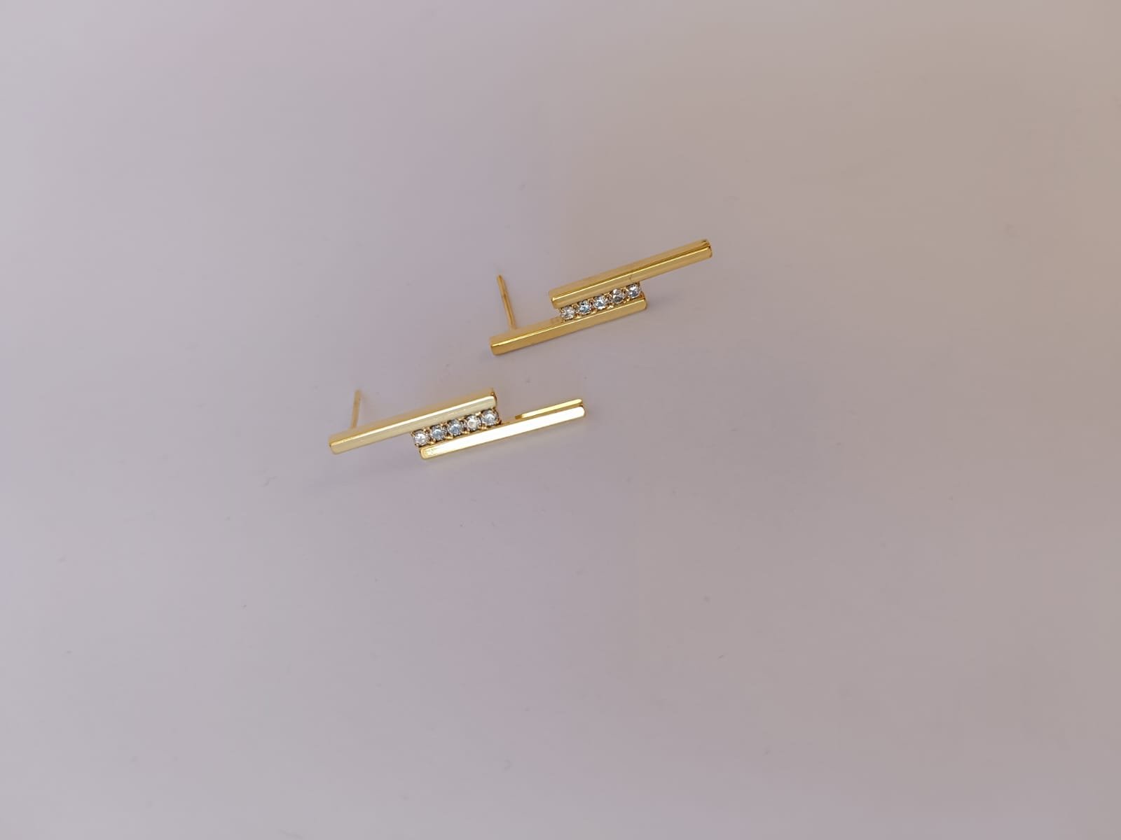 Brinco Geométrico com Duas Linhas Retas e Centro Cravejado – Design Moderno e Brilho Sofisticado
