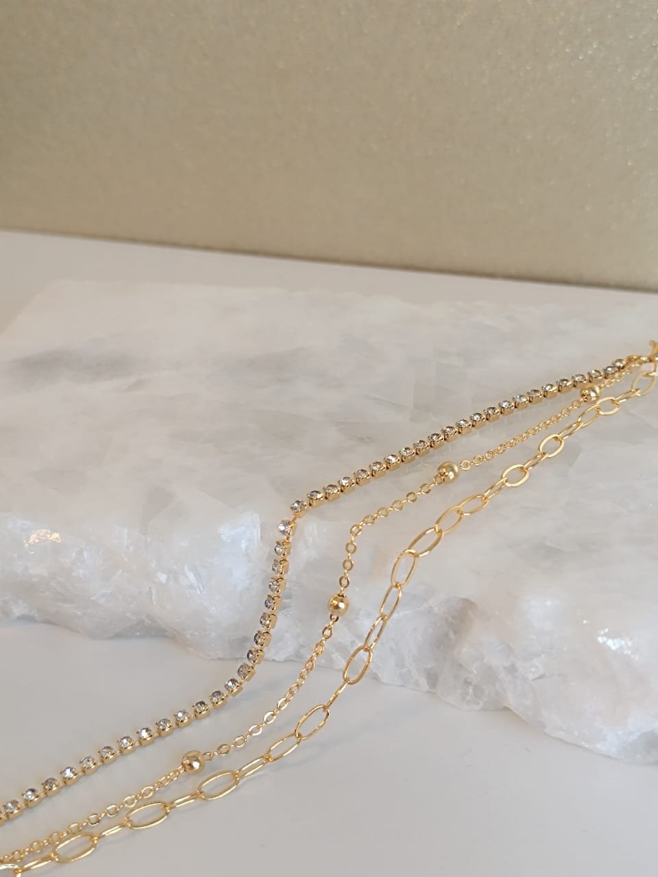 Três correntes em uma única peça, garantindo praticidade com visual de mix;