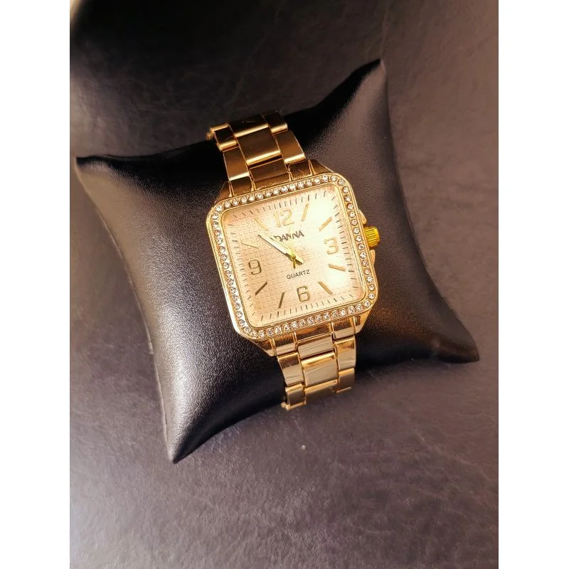 Este relógio de pulso foi criado para quem ama unir elegância e estilo clássico. Seu mostrador grande em formato quadrado, adornado com zircônias delicadamente cravejadas, transmite luxo e presença de forma sutil e refinada.